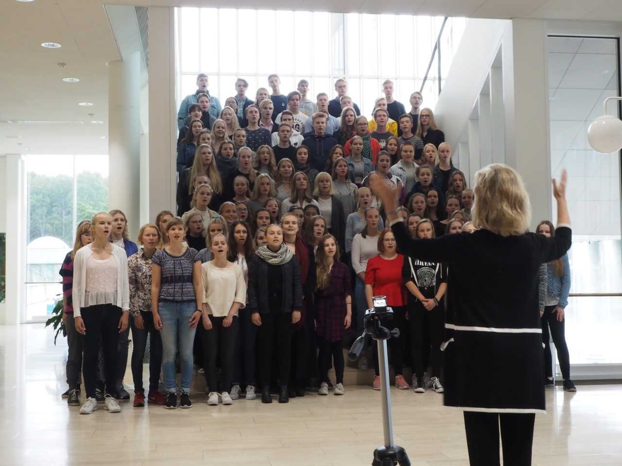 Tapiolan lukio oli sateesta huolimatta kuoron rivistössä hyvin edustettuna. Laulamassa oli opiskelijoita myös muista lukioista, kuten esimerkiksi Etelä-Tapiolasta, mutta suurin osa laulajista oli oman lukiomme musiikkilinjalaisia. Kuoroa oli johtamassa oman lukiomme musiikinopettaja Tuula Tikkanen.