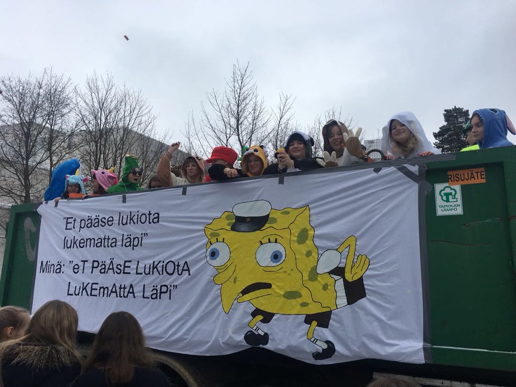 Rekat lähtevät liikkeelle, ja tunnen itseni voittamattomaksi. Rekat kiertävät ja kaartavat abiturientit kyydissä riemusta huutaen. Puhallan torveen, joka kajauttaa hullunkurisen äänen ilmoille. Tunnen tuulen viiman hivelevän poskiani, kuulen takana olevien rekkojen tuuttausten voiman, ja nyt se tapahtuu – olen hullaantunut.