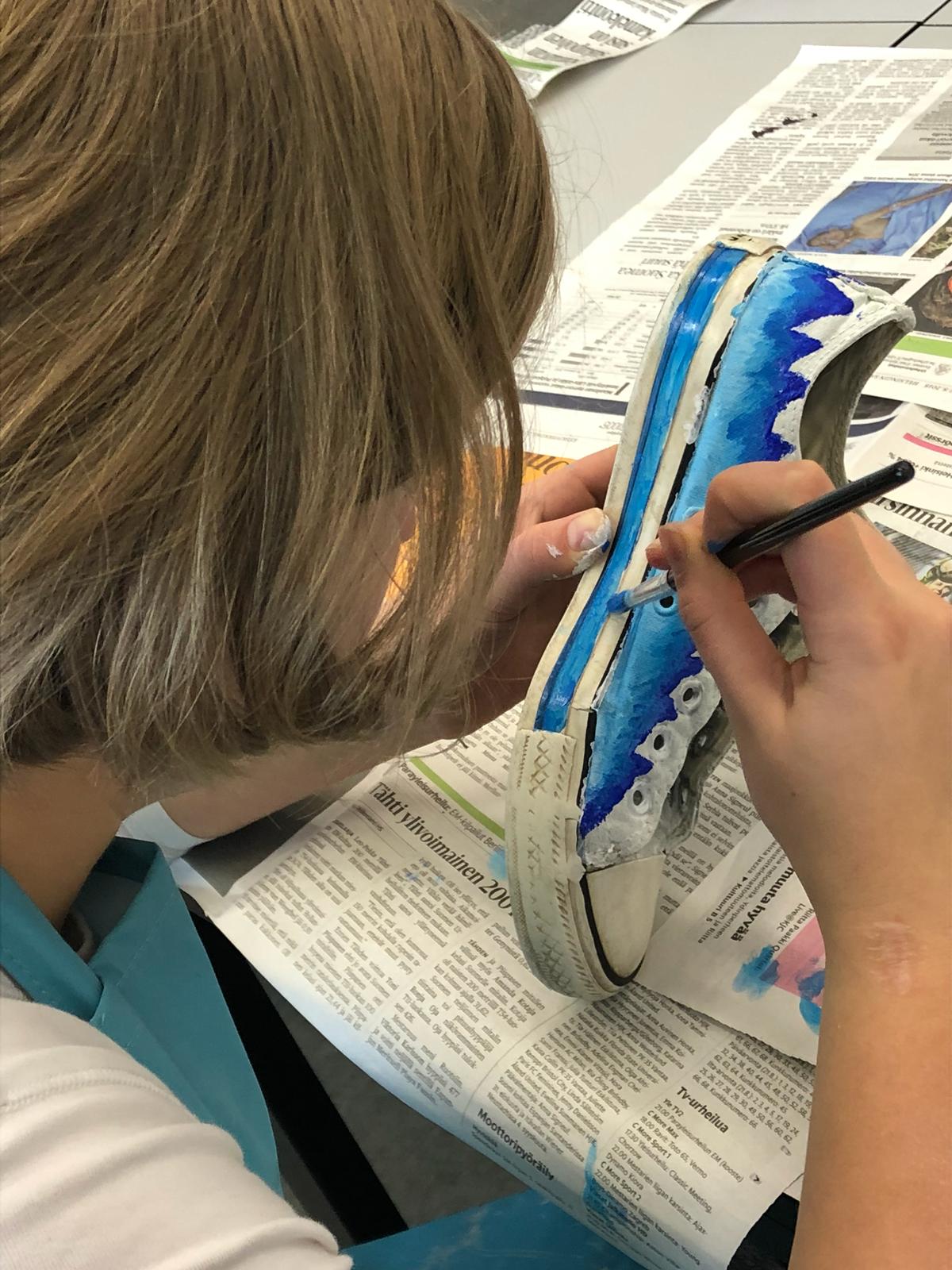 Koulumme vietti tänä vuonna 60-vuotisjuhlaviikkoaan noin kuukausi sitten, 5. – 10.11. Sen kunniaksi oli paljon ohjelmaa, joista yksi oli koko koulun voimin toteutettu yhteisötaideteos. Jokainen meistä toi kouluun vanhan kengän ja maalasi sen kuvataideluokassa akryylimaaleilla. Kengät sijoitettiin koulun käytävien varsilla oleville ikkunalaudoille symboloimaan tätä usean opiskelijan omasta polusta koostuvaa yhteistä, pitkää opin taivalta Tapiolassa.