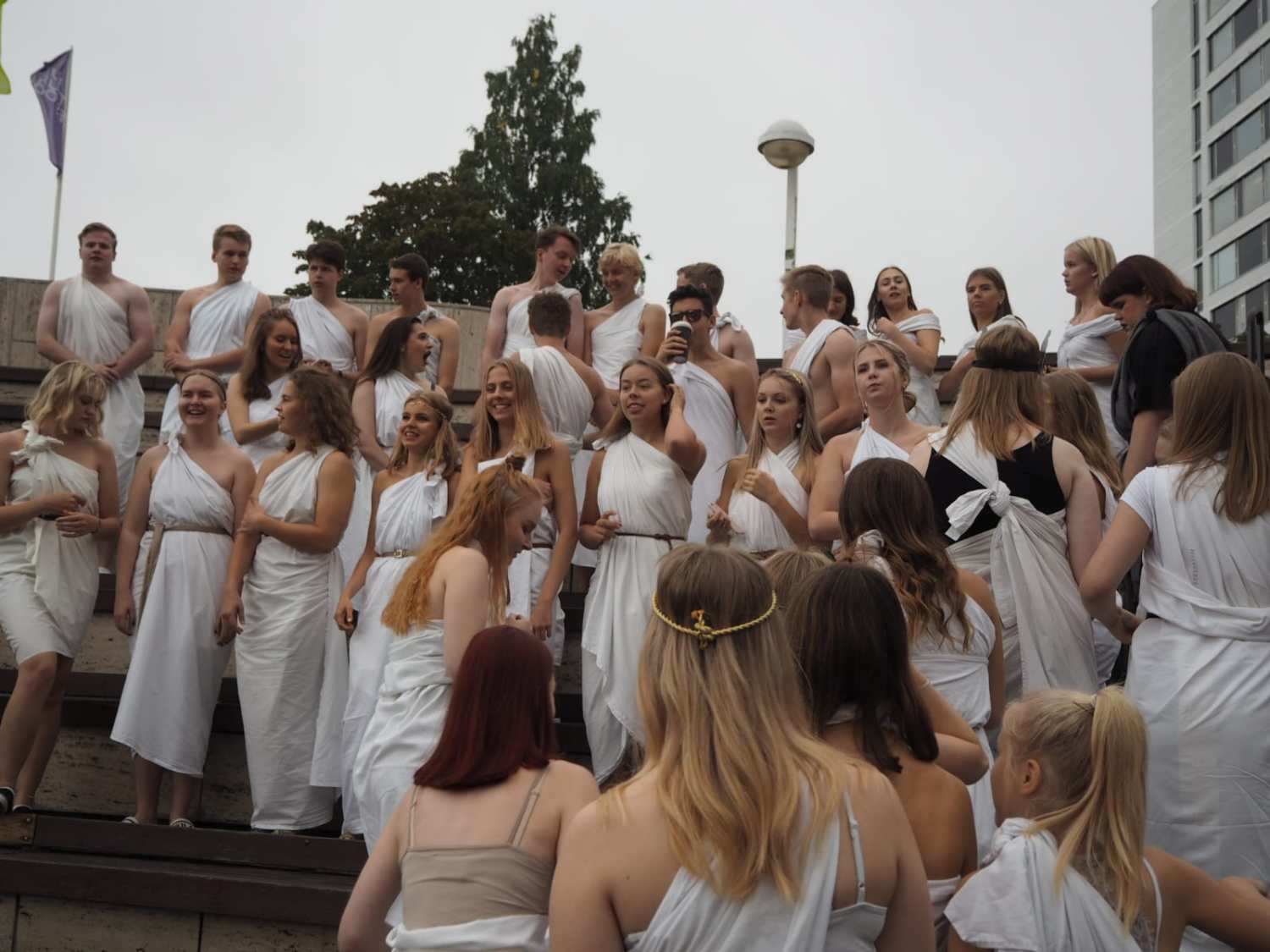 Päivän kohokohta olivat kuitenkin tuttuun tapaan pukuloistollaan koko koulua säväyttäneet jumalat. Lakanoiden sidontamenetelmistä syntyneistä opillisista eroista huolimatta kaikki onnistuivat pysymään täysissä pukeissa koko päivän, ja kun jumalalliset abit ryhmittyivät Kulttuurikeskuksen päivän teemaan sopivalle amfille yhteiskuvaa varten, lopputulos oli suorastaan häikäisevä.