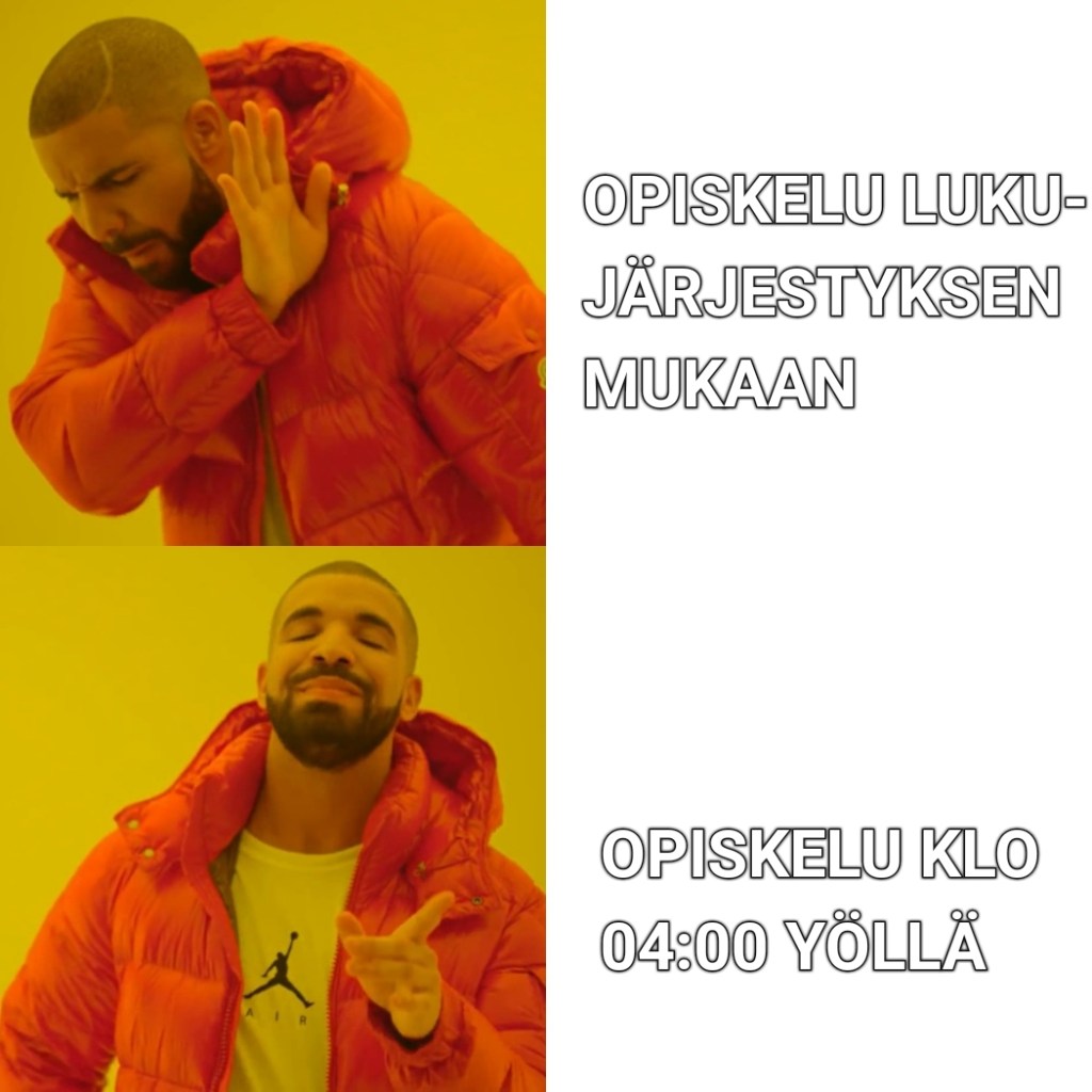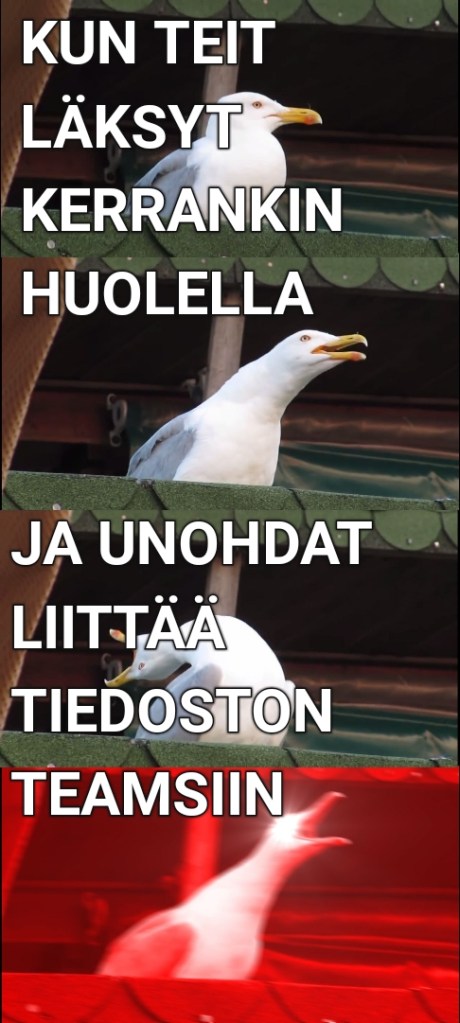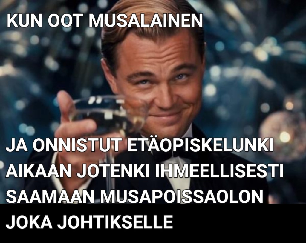 1/20202020Lukio Meemejä: Totuus etäopiskelusta aadailvonen 25 toukokuun, 2020 0 Comments Jaa tämä: Click to share on X(Avautuu uudessa ikkunassa) X Jaa Facebookissa(Avautuu uudessa ikkunassa) Facebook Tykkää Lataa... Kategoriat1/2020, 2020, Lukio, Opiskelua ja lukioelämää, Vitsaset