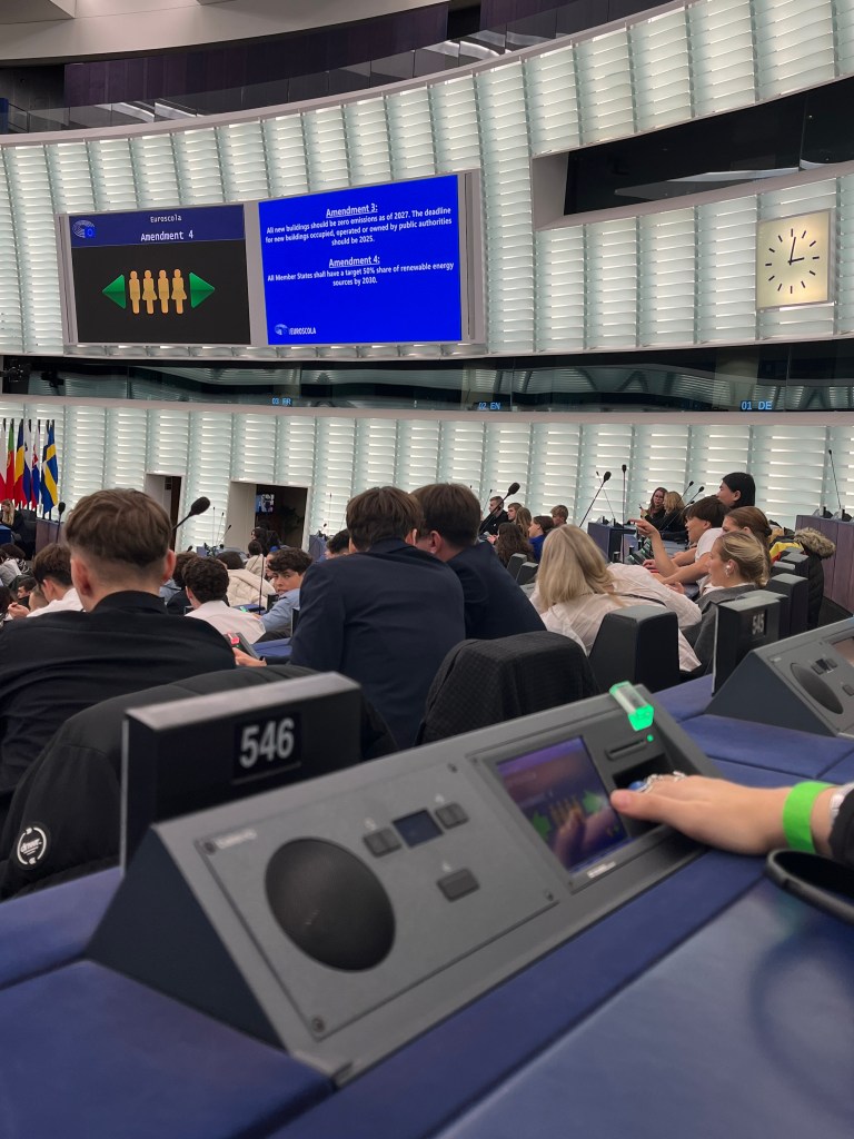 Päivän aiheena on EU:n energiakriisi sekä ilmastotoimet energian suhteen. Yleinen keskustelu käydään englanniksi ja ranskaksi, mutta käännöksen voi saada kuulokkeisiin myös saksaksi, italiaksi ja espanjaksi. Puheenvuoroja pyydetään perinteisesti viittaamalla. Ideana on väitellä eri puolueiden jäsenten välillä yleisesti keskustellen sekä äänestää Euroopan komissiossa käsitteillä olevista EU-lakiuudistuksista. Keskustelu ei ehkä onnistu parhaiten, kun samat ihmiset saavat useampia puheenvuoroja ja toiset eivät saa puhua lainkaan, mutta keskustelu on silti avartavaa. On kiinnostava huomata, miten jokaisen oma kansalaisuus kuuluu heidän puheenvuoroissaan: esimerkiksi saarivaltioiden ongelmat eroavat Suomen ongelmista aika lailla.