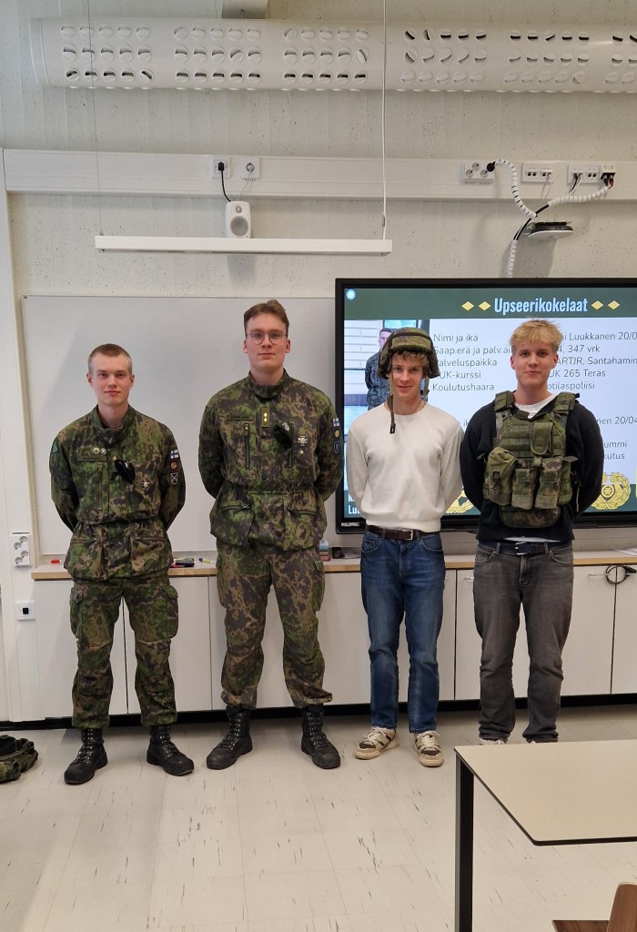 Aktiivinen kansalainen -opintojaksolla oli paljon maanpuolustukseen liittyviä tilaisuuksia keväällä 2025. Saimme kuulla kahdelta Tapiolan alumnilta Teemu Suomiselta ja Aarni Luukkaselta heidän inttikokemuksistaan reserviupseerikoulussa. Tapiolan yläkoulun legendaarinen liikunnanopettaja ja entinen taistelusukeltajien kouluttaja Lauri Särkilahti taas kertoi tapahtumarikkaasta urastaan. Lisäksi saimme vieraaksemme Utin jääkärirykmentin lentoupseerin, ja lopuksi Maanpuolustuskorkeakoulun (MPKK) viestintäkapteeni Antti Paasikosken kävi kertomassa taipaleestaan puolustusvoimissa.