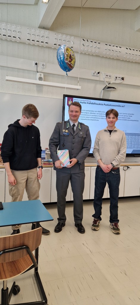Kirsikkana kakun päällä neljäs vierailija eli MPKK:n viestintäkapteeni Antti Paasikoski esitteli Maanpuolustuskorkeakoulua jatko-opiskelupaikkana. Hän kertoi opiskeluarjesta, uramahdollisuuksista ja omista kokemuksistaan Puolustusvoimissa. Tiesitkö, että koulu on opiskelijamäärältään Suomen pienin yliopisto ja siellä opiskelemisesta saa palkkaa? Paasikoski kutsui meidät myös vierailulle Santahaminaan, ja tähän kutsuun odotamme kyllä Liimataisen ensi syksynä tarttuvan!