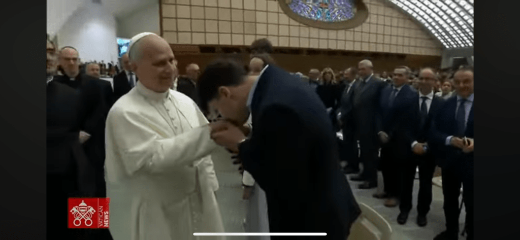 Paavi kuitenkin myöhästyi aikataulusta, minkä vuoksi alkuperäiset suunnitelmat muuttuivat. En mennytkään lavalle paavin luokse, vaan hän käveli itse yleisön pariin, missä istuin italialaisten poliitikkojen ja vaikuttajien kanssa. Paavi kätteli meidät kaikki yksitellen. En siis päässyt kertomaan paaville viikostamme, mutta pääsin suutelemaan Il Papan kättä – se oli hetki, jonka varmasti muistan lopun elämääni.