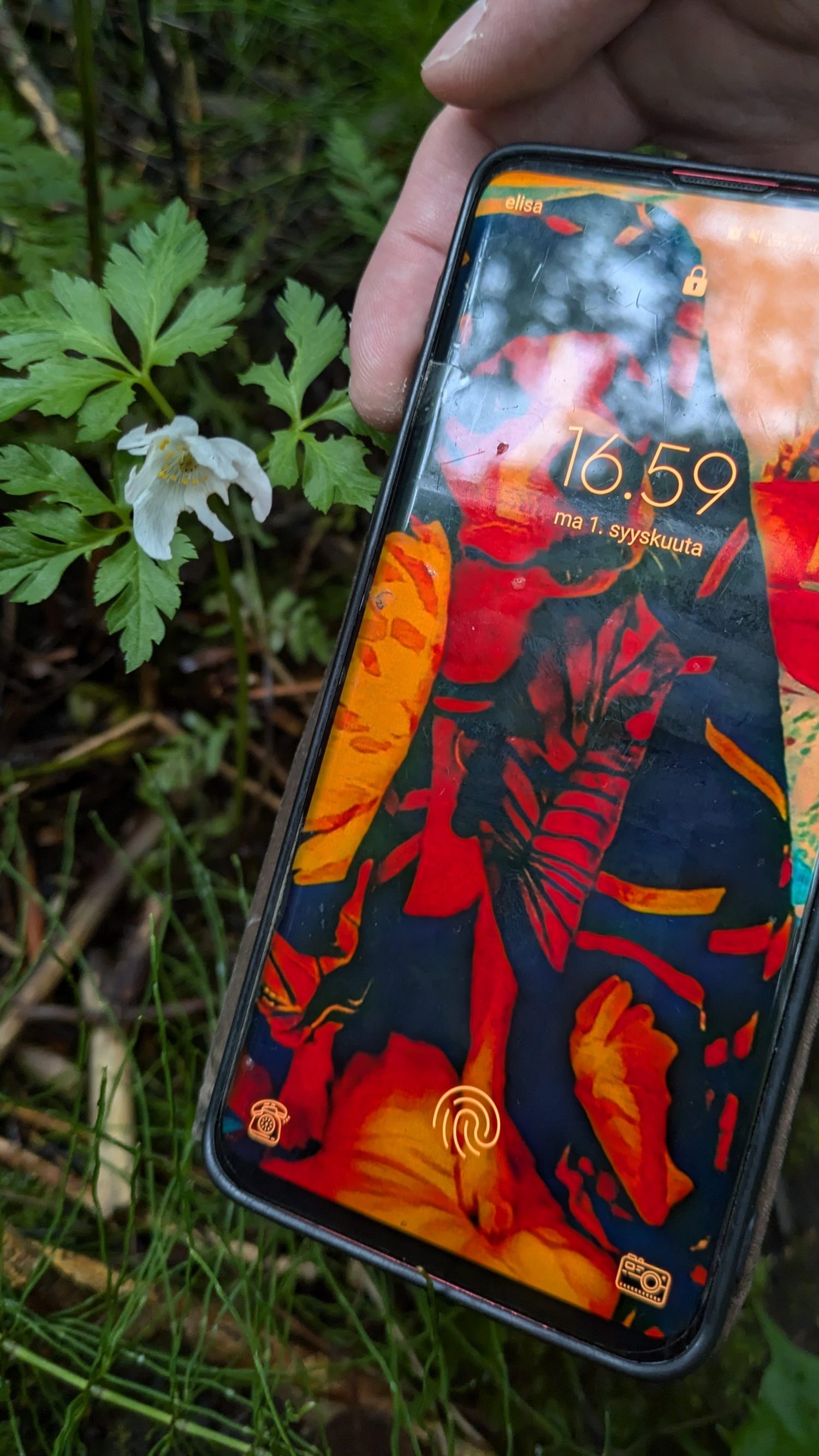 Oheisessa kuvassa näkyy itse kasvi sekä päivämäärä ja kellonaika. Kukan terälehdet ovat kärsineet ja putoamaisillaan. Löydön tekivät Blondine Lindfors ja Valtteri Luoma 24E Mankkaan metsissä samoillessaan.
